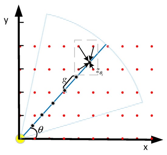 For determining the influence of the terrain occlusion in any sensing direction of the sensor node, it is necessary to estimate the ground surface height in this direction since the terrain surface is discretized into elevation points, as shown in Figure 4. For any sensor node with a sensing radius of r on a discrete grid point, taking the node coordinates as the origin, the sensing direction angle as the step direction, and g/cosθ as the step length, where g is the distance between discrete grid points. The elevation value of each stepped point is calculated by interpolation of the four surrounding grid points. Then, the elevation values for all step points within the perceptual range r in the perceptual direction θ can be obtained.