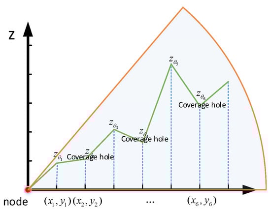 By increasing the sensing direction angle θ in the range , it can be determined whether each grid point in the sensing range of the node is affected by the terrain occlusion.