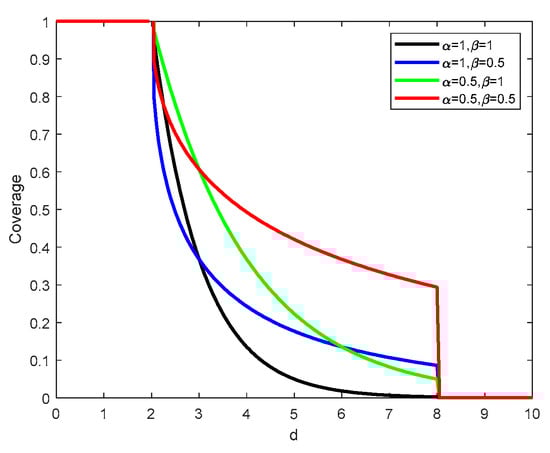are attenuation factors that determine the degree of attenuation of the perceived probability of a node in an uncertain sensing region with distance. The relationship between and is shown in Figure 6. In the figure, R is set to 5 and r is 3. When , the perceived probability decays faster. When , the probability decays slowly. The values of can be selected according to the actual situation of the node to meet different coverage requirements.