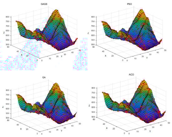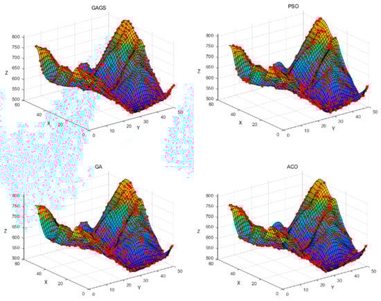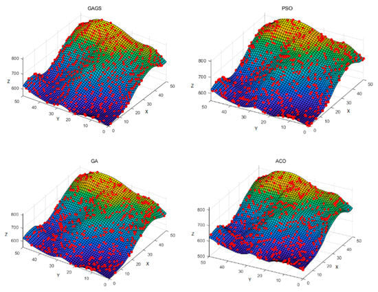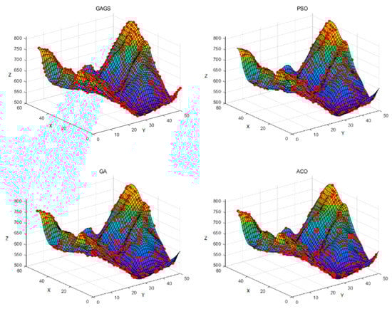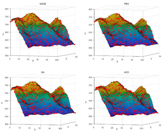 Figure 8 presents the deployment simulation of nodes using the general surface model. Since the surface model’s projected area is the same, increasing the terrain complexity will increase the surface area and correspond to the number of nodes that need to be deployed. In this case, GAGS uses 486 nodes to achieve full coverage, but when the number of deployed nodes is the same, the deployment coverage of PSO is 83.24%, and GA and ACO are 83.52% and 93.56%, respectively, as is shown in Figure 10b.
