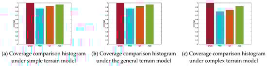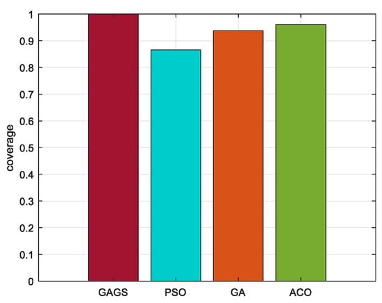 The deployment results under different coverage thresholds are presented in Figure 13. It can be seen that reducing the coverage threshold φ will expand the coverage of a single node, which means that the number of deployed nodes in the same area decreases. At this time, GAGS achieves full coverage after deploying 375 WSN nodes. The coverage rate of PSO is 86.08%, the coverage rate of GA is 95.44%, and the coverage rate of ACO is 96.11%, under the condition of deploying the same number of nodes. In order to more clearly observe the performance gap of each algorithm, the coverage histogram under the deployment of the same number of nodes is shown in Figure 14.