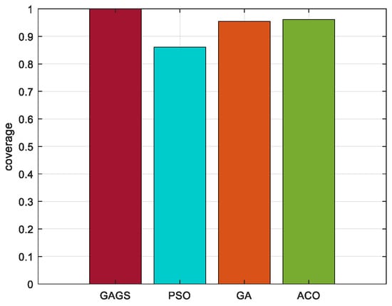 The deployment results are shown in Figure 7, Figure 8 and Figure 9. The deployment results of the proposed GAGS are more uniform than the other algorithms. Furthermore, to more intuitively demonstrate the superiority of the proposed algorithm in terms of coverage, we compare the coverage rate of different algorithms after deployment, as shown in Figure 10.