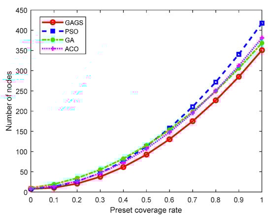 Obviously, when the preset coverage rate is small, the number of nodes deployed by each algorithm is roughly the same under the premise of meeting the coverage requirements. When the demand for regional coverage is high, the algorithms need to increase the number of nodes to improve the coverage. Through comparison, it is concluded that the GAGS algorithm can meet the coverage requirement under the condition of deploying a lower number of nodes, which is much more cost-effective.