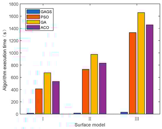 The execution time of each algorithm under different surface models was compared. The deployment parameters of all algorithms are shown in Algorithm 1, and the comparison results are shown in Figure 16. With the increase in the complexity of the surface model, the deployment time for all the algorithms has increased. However, the execution time of the GAGS algorithm is significantly shorter than that of the other three algorithms. It shows GAGS can effectively reduce the amount of calculation and the cost.