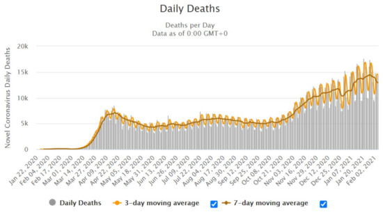 - Coronavirus Worldwide Graphs. Available online: www.worldometers.info/coronavirus/worldwide-graphs/ (accessed on 6 February 2021).