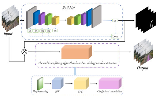 In this paper, an algorithm based on state-of-the-art deep learning convolutional neural networks is proposed to overcome the deficiencies of the aforementioned detection methods. This algorithm is mainly used in local trains and city railways. First, the RailNet is designed to preprocess images, extracting the key information and output the binary segmentation maps, which is robust to unnecessary noise. The rail lines are segmented from the background, and the feature of tracks are preserved without interference from other objects [18]. Afterward, the binary segmentation maps pass through the post-processing part of the RailNet, namely the sliding window detection algorithm. The algorithm is mainly composed of three steps: Inverse Perspective Transformation (IPT), Feature Point Extraction (FPE), and Rail Lines Curve Fitting. Moreover, the fitting results are mapped to the original images, and the rail lines are finally marked on the authentic images. An overview of the entire process of the algorithm can be seen in Figure 1.