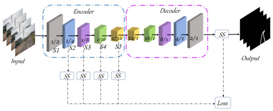 Overview of the RailNet architecture. From left to right, the model receives input images from a forward-looking camera and outputs binary segmentation images. The RailNet is mainly composed of two parts: the encoder and decoder. The detailed structural information of the network is shown in Table 1. SS refers to the Segmentation Soul section.