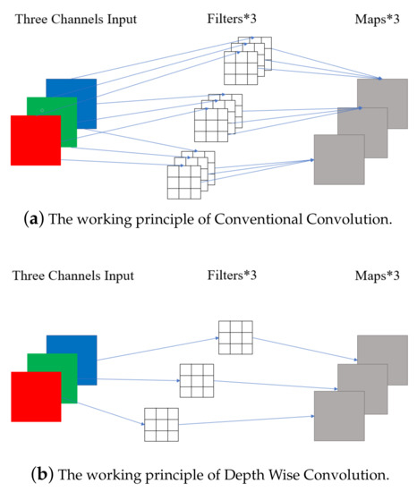 Comparison between Conventional Convolution and Depth Wise Convolution. Different from the Conventional Convolution operation, one convolution kernel of Depth Wise Convolution is responsible for one channel, and one channel is calculated by only one convolution kernel. However, the Conventional Convolution kernels operate each channel of the input picture at the same time. It can be seen from the figure that the calculation amount of Conventional Convolution is three times that of the Depth Wise Convolution.