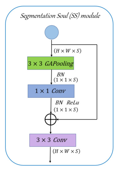 To further improve the segmentation accuracy, we propose a booster training strategy [24], called the Split Soul (SS) module. This module consists of a global average pooling layer, a convolution layer, and a convolution layer. The specific structure details of the SS are shown in Figure 4. More specifically, it is similar to a catalyst in chemical reactions: it can enhance the feature representation in the training phase and can be discarded in the testing phase. Accordingly, it increases little computation complexity in the testing phase. We can insert the Split Soul (SS) module to different positions of the RailNet. In general, it improves the segmentation performance without any extra testing time.