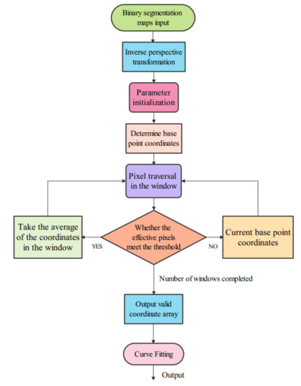 After that is the sliding window detection of the feature map: First and foremost, the parameters are designed and initialized, including the number of sliding window detection, the height and width of the sliding window are obtained by image size and the number of detection [28]. Next, In the process of feature point detection in a sliding window, the window pixels are traversed, and the coordinates of non-zero pixel values are recorded. When the number of effective pixels in the window is less than the threshold, the window width is increased by the window height and width until the minimum number of pixels is met [29]. Furthermore, taking the average value of the abscissa of the effective pixels in the sliding window as the base point coordinate of the next sliding window, iterative detection is carried out until the total number of sliding windows is satisfied [30]. Last but not least, after the feature point detection deadline, the target array is the feature point of the detected target.