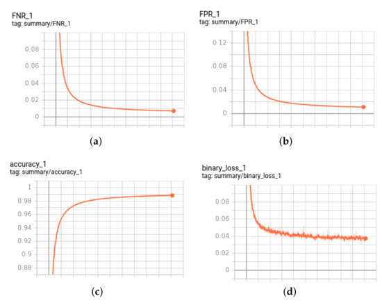 Training process of the RailNet. (a) FNR result. (b) FPR result. (c) Accuracy result. (d) Loss function result.
