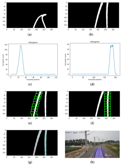 Experiment process of the algorithm. (a) Binary segmentation diagram. (b) Inverse perspective transformation diagram. (c) Histogram detection of left rail diagram. (d) Histogram detection of right rail diagram. (e) Result of sliding window detecting left rail. (f) Result of sliding window detecting right rail. (g) Schematic of characteristic point curve fitting. (h) The final rail line prediction.