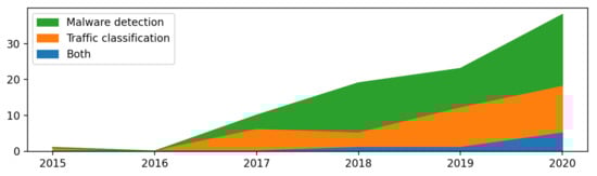 There is a striking change in the number of research papers that are devoted to the analysis of network traffic by CNN models (see Figure 1). To enhance the analysis, we distinguish three possible subjects of the articles: malware detection, traffic classification, and the junction of both. These categories are connected with datasets studied in each paper. The typical indicators of the datasets are the motifs of data, e.g., captured botnets are the foundation of the CTU-13 dataset, so each article utilizing it will belong to the malware detection group.