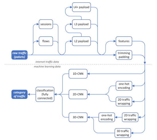 Depending on the available datasets (see Section 2.4) and implemented machine learning algorithms, traffic datasets can directly feed the chosen CNN-based deep learning model (CDM) or may have to be pre-processed according to several paths, as is presented in the upper part of the workflow diagram in Figure 2. Different possible side paths—raw traffic processing or filtering—are indicated with blue arcs.