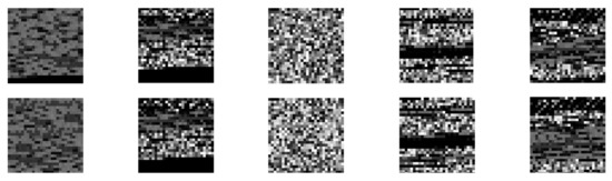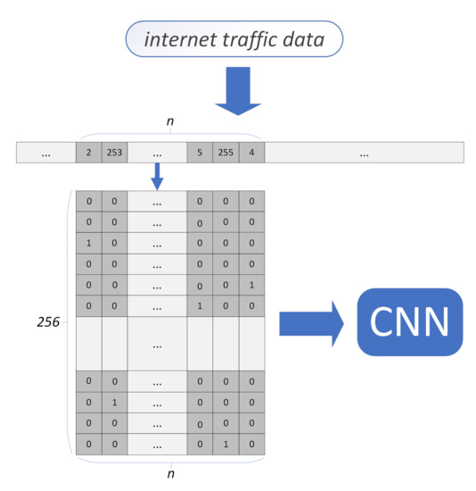 The second technique of increasing the traffic data dimensions is one-hot encoding. This approach replaces numerical integer values by the binary vector such that all but one of its elements equals zero, and the unique element equals one. Such an approach is applicable for numerical variables belonging to a finite set of m possible values (for example, a value of a byte belongs to the set of possible values). The one-hot-encoder thus inputs an integer of m values and outputs a binary vector of size m, containing value one at the position related to the current input values and zero elsewhere (an alternative solution encodes n-values variable as a binary vector of size , where the n-th input value is encoded as an all-zero output). Replacing single values by vectors converts the 1D vector of integers into a 2D binary array—see Figure 5.