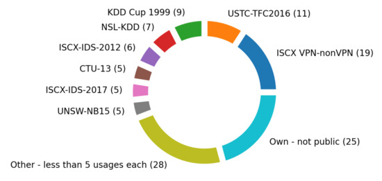 The crucial role in all machine learning methods is that of the datasets. They are necessary to perform the learning process of classifiers. They also help compare various approaches. In the case of traffic classification, several open datasets are commonly used in papers under study. The datasets include various types of traffic data: raw traffic, flows and features. Short characteristics of the most frequently employed in the studied papers are listed in Table 1. Figure 7 shows the popularity of particular datasets in the investigated papers.