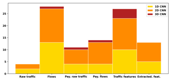 What is particularly interesting seems to be the overview from the perspective of traffic transformation methods before being given as an entry to the CNNs. Deep learning models require particular data formats that are rarely similar to original computer traffic. In most of the reviewed articles, the traffic data are transformed into the forms needed for the analytical part of the whole workflow. These transformations usually require performing one or more typical actions, e.g., the selection of specific network layers, trimming the data stream, or computing some traffic features. Due to the given architecture of some learning algorithms, these data transformations often demand an increase in the dimensionalities of the traffic data. The network traffic data are a time series, while the CNNs require multidimensional input consisting of equal-length samples. Due to this fact, the original traffic data must always be transformed into a format acceptable by the deep-learning models.