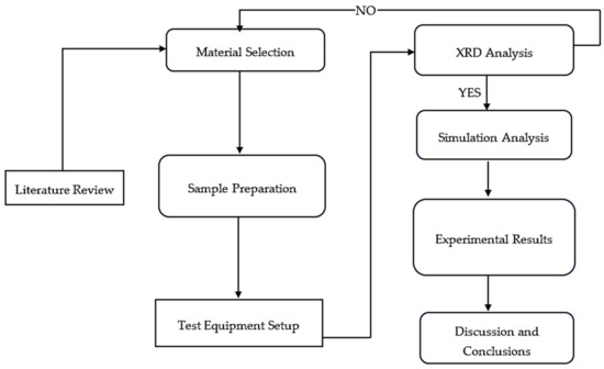 This research was conducted mainly in four steps. Firstly, materials were selected based on their texture and resistance. Then, XRD tests are performed to observe its atomic and molecular structure, and their curves obtained are matching with the standard patterns. Then, the electric field behaviors of the proposed compounds are obtained and analyzed in the FEA software, and lastly, practical experiments are conducted to observe the breakdown behavior of the samples. The schematic flowchart for the research methodology is shown in Figure 3. A brief explanation of each phase is briefly explained in the subsequent passages.