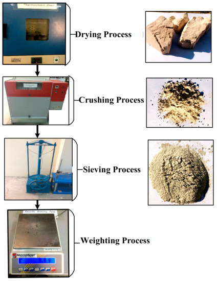 Prior to experimental investigation, the proposed samples’ texture was carefully observed; bauxite, laterite, china clay is in rock form, while silica sand and rock sand were in crystal form. Several steps were followed to convert samples in rock form to refine powder form appropriate for lab tests. The first step is the drying process, in which the rocks were placed in open atmosphere air and sunlight for two hours and then in a microwave oven for two days (the temperature of the oven was set to 105 °C). The samples were dried to regain their natural form and make it easy to crush the dry rocks. The temperatures applied to the samples are closely monitored so that its properties are not affected by applying heat for a prolonged period of time. The next step is the crushing process, in which the samples were crushed to powder form in a Los Angles Abrasion machine with 12 steel balls and a 60 mm diameter drum. Abrasion machine rotation was set to 500 turns, and the process was repeated three times. The next step of the sample preparation process is the sieving process, in which different sizes of the sieve are used in a sieve shaker machine to obtain a uniform powder. The samples must be sieved properly and pure from impurities so that their morphological structure is retained. The final step is the weighing process, in which all the samples are carefully weighed before the experiments are performed. Figure 4 shows all the steps involved during the sample preparation process.