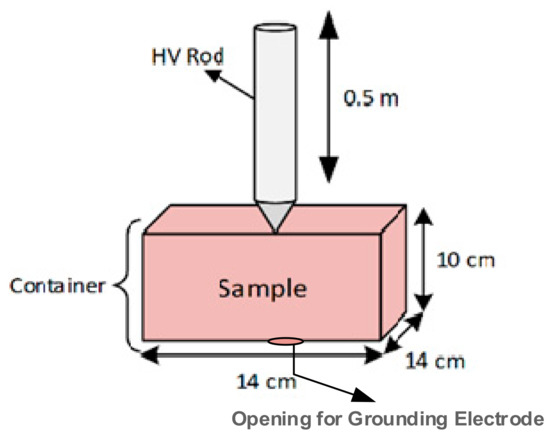 The test specimens prepared for experimental purposes are placed inside a container measuring 14 cm in length, 14 cm in width, and 10 cm in height, as shown in Figure 5. High voltages were applied through HV Rod, and a hole with wrapped aluminium foil on the bottom sheet of a container is connected with a grounding electrode. The container comprised an acrylic sheet with a 2 cm internal diameter to withstand the high magnitude voltages and current. The container was seated on a stand to attain a suitable height and was grounded to the equi-potentization ground surface of the high-voltage lab.
