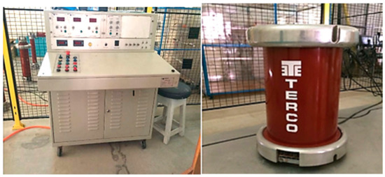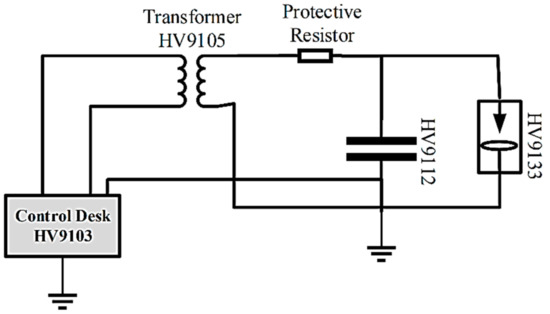 Two stages of the TERCO Test transformer up to 200 kV (HV 9105) are used. For protection purposes, a resistor was connected while performing the test. The AC voltage of already-known values was applied to the measuring apparatus and voltmeter to calibrate it to avoid any error and improve the accuracy of the experiments. The block diagram of the AC setup is shown in Figure 7.