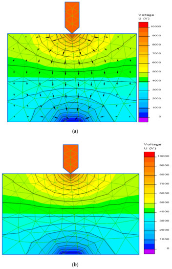The effective resistivity of two ordered mixtures, i.e., having the same proportion of materials, can be found using Equation (5). Figure 9 reveals the voltage distribution with and without electric field vector presentation.