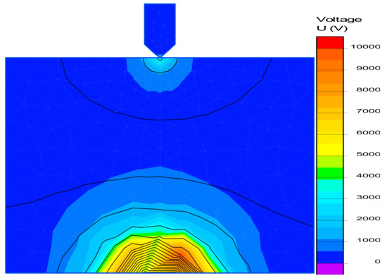 where δ is conductivity, ε is the dielectric constant, J is the current density (A/m2), and ᴇis is the electric field strength (V/m). The surface plot of voltage showing vectors of electron strength from a high-voltage electrode to the ground and without electron strength is shown in Figure 8. Furthermore, the surface plot of the laterite green and bentonite mixture is shown in Figure 10. The container of dimension 14 × 14 × 10 cm3 is designed in solver and assigned properties of a material to it. The copper rod with a pointy tip is designed and made in contact with the material. A vertex P1 is selected at the top of the container. After completion of the simulation, a parametric analysis of the results was performed. In the parametric analysis, the vertex P1 is displaced downward with the step size of 0.4 cm; the parametric analysis will help us get the electric field strength of materials from the tip to the end. The electric field strength is strong at the tip point, as this is the point where high voltage is applied. The field strength is weak at the middle point; the electric field strength is firm at the bottom. The field strength is weak in the middle, as we have assigned it with the properties of our proposed material, which are conductive in nature; the bottom region is the grounding point. Its high intensity reveals that incoming charges are effectively grounded. Figure 10 shows the electric field intensity when 10 kV of voltage is applied to bentonite and laterite green mixture. Figure 11 shows the meshing and design of the grounding system composed of a high-voltage electrode and the container comprising grounding materials.