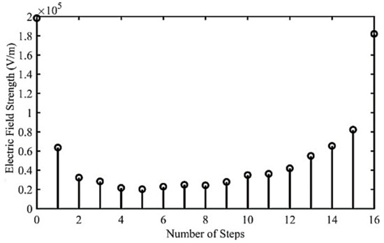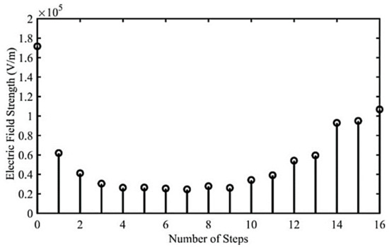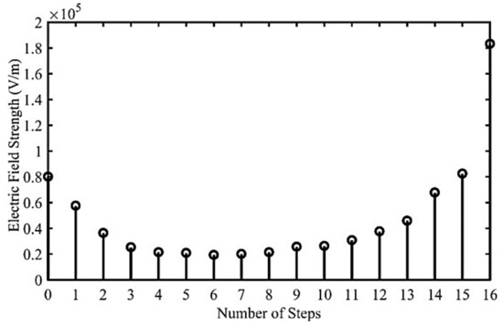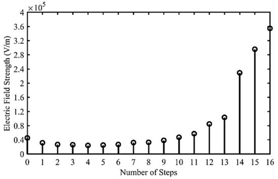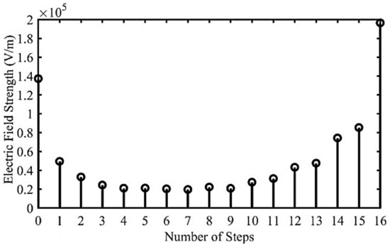 The line plot of the electric field intensity of the laterite green and bentonite mixture is shown in Figure 12. The vertex point is displaced from the tip of the electrode to the bottom of the material using 16 steps of equal size (0.4 cm). The field strength at the top is a maximum of 4 × and nearly equal to 1.5 in the middle of the container. The field strength increases at the bottom of the container, illustrating that the proposed mixture allows for the shortest path for the incoming surges and immediately grounds the high voltages, as the field strength is minimum at the center and maximum at the ground plate of the container. The vertical axis represents the electric field intensity, and the horizontal axis represents the equal distance of 0.4 from the tip of the high-voltage electrode to the ground electrode. The electric field intensity as a function of distance is shown in Figure 12, Figure 13, Figure 14, Figure 15 and Figure 16.