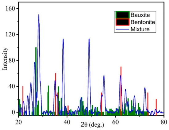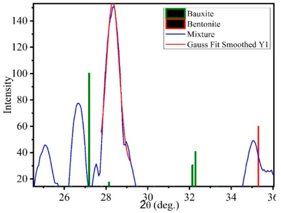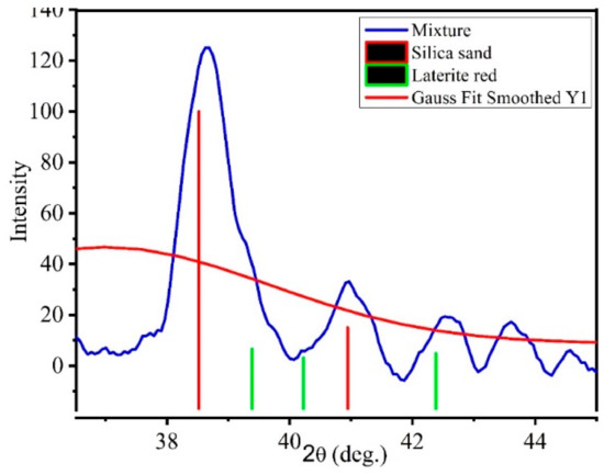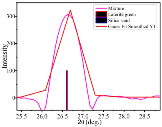 The Gaussian fitting graph of test samples are presented let us take laterite green and silica sand for explanation. Here, the pink line represents the laterite green and silica sand mixture curve. The vertical blue line represents the silica sand standard pattern, and the vertical red line represents the laterite standard curve. The horizontal red line is obtained by applying the Gaussian fitting smoothening factor. The vertical lines almost cover all the mixture curves; hence, it is proved that the sample tested shows properties equivalent to standard material.
