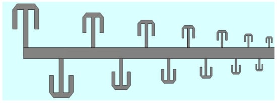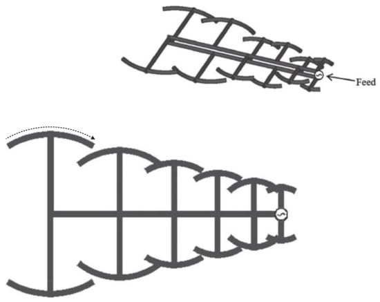 A unique variant of T-shaped top loading in the form of circular -arc T- shaped loading is presented in []. This study presents an LPDA operating in the frequency range of 0.82–2.09 GHz with an average realized gain of 5 dBi. This study claims a reduction in the dipole lengths by 55%. The reflection coefficient of the antenna depends highly on the radius of the circular arc dipole, and therefore, optimization of the circular arc radius needs to be performed in order to select the correct radius for the required design. Therefore, a similar approach can be used for PLPDA design. Figure 3 shows the implementation of the circular-arc T-shaped loading technique implemented on an LPDA in [].