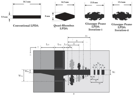 - Pirai, M.; RH, H. Size reduction of microstrip LPDA antenna with top loading. IEICE Electron. Express 2009, 6, 1528–1534. [Google Scholar] [CrossRef][Green Version]