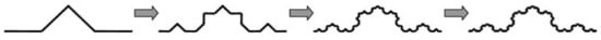Another attempt to miniaturize the conventional PLPDA was demonstrated in [] using second-order Koch fractals. This reference shows how higher-order Koch fractals can be generated using four iterations. However, the proposed PLPDA antenna in this reference used second-order Koch fractals to miniaturize a nine-dipole conventional PLPDA. The proposed PLPDA has reduced dimensions of 90 mm × 60 mm compared to that of the conventional PLPDA, whose dimensions were 120 mm × 90 mm. This PLPDA operates from 2 GHz to 8 GHz and has an average gain of 5.8 dBi. Figure 5 shows the iterative process used to obtain the second-order Koch fractals in [].