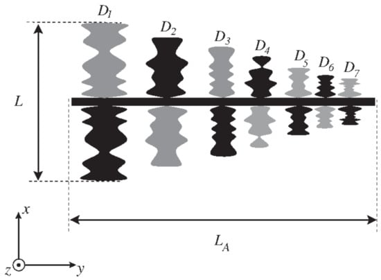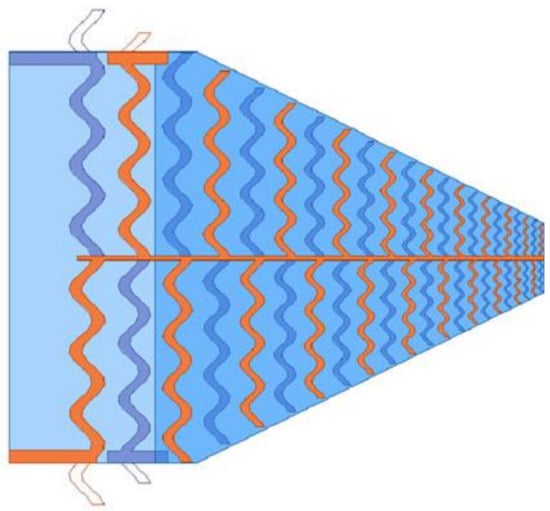 An interesting approach was suggested in [], where instead of introducing reactive loading, the concept of a non-uniform transmission line (NTL) was introduced in order to miniaturize the conventional PLPDA. This was completed by the modulation of the impedance profile of straight dipole elements to a truncated Fourier series using optimized Fourier coefficients. This technique achieved a 32% size reduction of the straight dipoles. The proposed PLPDA with truncated Fourier-series dipoles has an operating frequency range of 2–4 GHz and provides a peak gain of 7 dBi. Figure 6 shows the PLPDA design with modified dipoles achieved by optimizing Fourier coefficients [].
