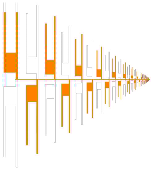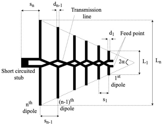 This section presents a wideband 25-dipole PLPDA that has an operating range from 0.7 GHz to 8 GHz. The antenna dimensions for the PLPDA were derived using traditional LPDA equations introduced by Carrel [,] and then calculating the dimensions with the effect of relative permittivity of the antenna substrate. A schematic diagram of the conventional LPDA antenna is shown in Figure 10.
