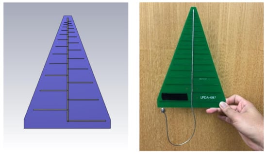 The antenna design was required to provide a gain of above 5 dBi in its entire operating range, and thus, in order to satisfy the bandwidth and gain specifications, 25 dipoles were selected. Similar to traditional LPDAs, this PLPDA also consists of dipoles that are arranged in an increasing fashion from the front to the back part of the antenna. The only difference is the dielectric substrate (FR4), with a relative permittivity of 4.3, is present between the top and the bottom boom instead of air. Therefore, it can be suggested that the top boom and the dipoles attached to it are embedded on the top part of the substrate, while the bottom boom and the dipoles attached to it are attached to the bottom part of the substrate. The thickness of the substrate is 1 mm. The feeding is provided to the antenna using a coaxial cable that is connected to the top boom using solder paste. The conducting part of the cable is soldered to the start of the bottom boom through a drilled hole. The overall dimensions of the proposed antenna are: 250 mm × 170 mm × 1 mm (length × width × thickness). The simulated and the fabricated model of the antenna is shown in Figure 11.