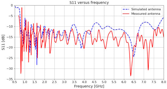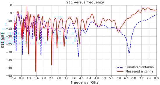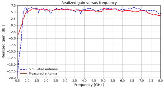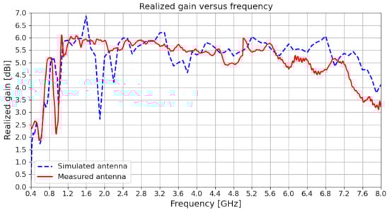 Figure 12 presents a comparison of the simulated and the measured return loss of the proposed antenna design. The graph suggests that the antenna has a low S11 below −10 dB in its entire operating frequency range from 0.7 GHz to 8 GHz. Thus, the antenna achieves good matching. Moreover, the graph also suggests that the simulated results are generally in good agreement with the measurements.