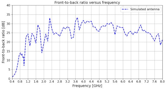 Figure 17 shows the front-to-back ratio of the proposed PLPDA design. It shows that the antenna presents highly directional characteristics; however, further improvements can be made to the antenna performance from 0.4 GHz to 0.7 GHz.