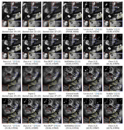 - Zhang, H.; Wipf, D.; Zhang, Y. Multi-image blind deblurring using a coupled adaptive sparse prior. In Proceedings of the IEEE Conference on Computer Vision and Pattern Recognition, Portland, OR, USA, 23–27 June 2013; pp. 1051–1058. [Google Scholar]