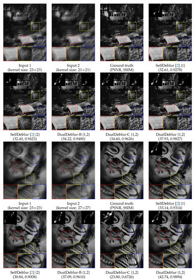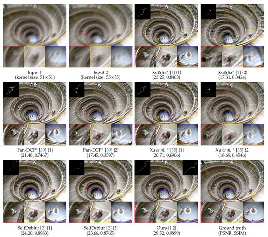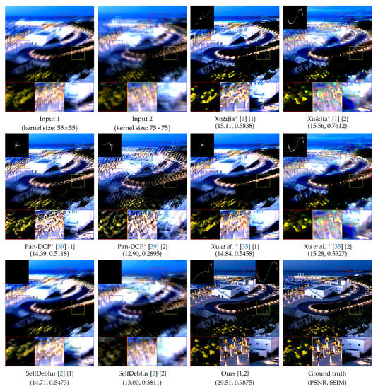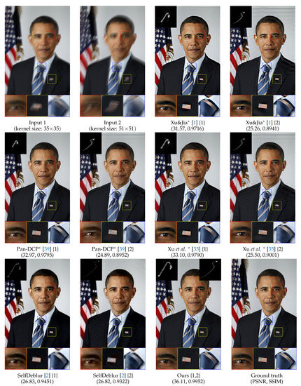 - Lai, W.S.; Huang, J.B.; Hu, Z.; Ahuja, N.; Yang, M.H. A comparative study for single image blind deblurring. In Proceedings of the IEEE Conference on Computer Vision and Pattern Recognition, Las Vegas, NV, USA, 27–30 June 2016; pp. 1701–1709. [Google Scholar]
