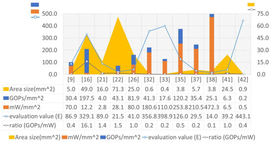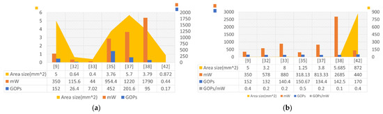 Figure 1 organizes the accelerators whose evaluation value E is in the grade of tens or hundreds from Table 2, Table 3, Table 4, Table 5, Table 6 and Table 7. References [20,34,36,40] are not included in Figure 1 because they lack the area data at the chip level. The power consumption data of [23,25,28] is only released at module-level, so to be fair, they are not listed in Figure 1, either. The yellow area in Figure 1 represents the area size of each accelerator. Every bar in Figure 1 is composed of two parts, up and down in blue and orange color, respectively. The upper part in blue represents the GOPs/mm2; the lower orange represents the mW/mm2. The two lines, the upper one and the lower one in Figure 1, represent evaluation value E and the ratio of GOPs and mW, respectively. To focus on accelerators targeting ultra-small areas, the accelerators whose area size is below 10 mm2 are selected, and their three key features are presented in Figure 2a. In Figure 2a, each accelerator contains two bars. The left orange one represents the power consumption in mW while the right blue one represents the computation ability, GOPs. According to Figure 2a, the accelerators can be grouped into two categories by area size as units’ grade and decimal grade. In the units’ grade group are [9,35,37,38]. On the other hand, Refs. [32,33,42] belong to the decimal grade group. In the units’ grade group, References [9,35] share a similar ratio of GOPs/mW while [37] has a relatively lower ratio, and [38] has the lowest ratio. The below analyzes the result of the ratio. Although [37] has close computation ability about 1.3 times [9] and 0.45 times [35], it consumes too much power, near 3.5 times [9] and 1.3 times [35]. When it comes to [38], its computation ability almost reaches a hundred but with huge power consumption, even higher than [37]. As a result, References [9,35] have better computation ability performance and power consumption in the units mm2 area grade. It is interesting to know that the area size and GOPs/mW ratio positively correlate in the decimal grade group. Reference [42] has a relatively large area size compared to its computation ability. For more detail, the next paragraph will introduce the analysis.