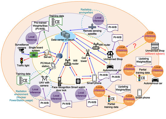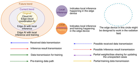 The latest generation telecommunication standard, e.g., 5G, can be a valuable technology in the future edge AI development when it comes to training on chips. Training on chips might require something like distributed computing, which is achieved by the Internet of things (IoT) through 5G or future communication protocols. The idea is shown as the orange oval illustrated in Figure 3.
