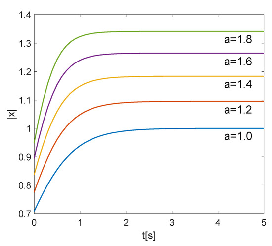 From Equation (5), we observed that the saturation phenomenon of output signal occurs when time, , increases. As shown in Figure 2, the amplitude of the output signal is affected by the system parameters and . The saturation state is , and is limited between and by the calculation. Output saturation is an inherent characteristic of CBSR, which is not affected by the input signal and noise. The steep barrier wall of the potential well is the cause of output saturation. When the saturation phenomenon occurs, the output signal of SR is the local optimal solution, which limits the weak signal detection performance of the system.