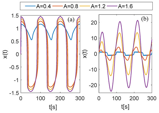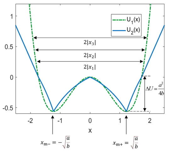 Although Equation (6) is a complex expression, the complexity of the proposed method increased slightly because we used the fourth-order Runge–Kutta method to solve Equation (1). From Figure 3, the difference between two potential function curves of CBSR and UBSR can be observed. Two potential wells with minima were located at and the barrier height was . Due to the trend in the potential function of CBSR to be steep when , the amplitude of the output signal increases slowly and tends to a stable value gradually, which limits the signal enhancement ability of the CBSR. For UBSR, the amplitude of the output signal was unlimited and increased linearly; thus, UBSR avoided output saturation.