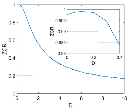 Significantly, the variable affects the number of zero-crossing points. A few zero-crossing points caused by noise are retained when is larger. Actual zero-crossing points caused by the periodic signal are partly be removed when is smaller. To ensure the periodicity of the output signal, the value range of is [16]. In this paper, we suppose that is 0.3. Figure 5 shows the trend in the ZCR versus the noise intensity, . We observed that the closer to 1 the ZCR is, the more obvious the periodicity of the output signal is.