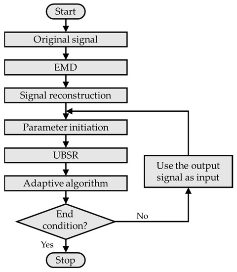 In practical applications, it is difficult to detect multi-frequency weak signals with strong background noise at the same time. It is also difficult to detect the target signals by using EMD or SR alone. Therefore, we constructed EMD-AUBSR for the detection of multi-frequency weak signals by combining the advantages of EMD and UBSR. Figure 7 shows the algorithm flow chart.
