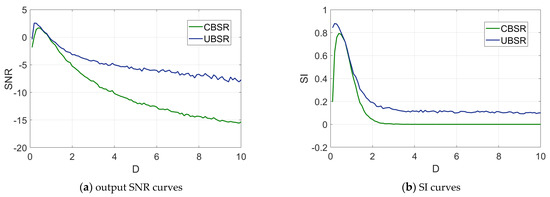 When the noise intensity is zero, the input signal frequency is 0.01 Hz, the system parameters satisfy , and the sampling frequency is 5 Hz, the output curves of CBSR and UBSR for different values of amplitude are as shown in Figure 4.