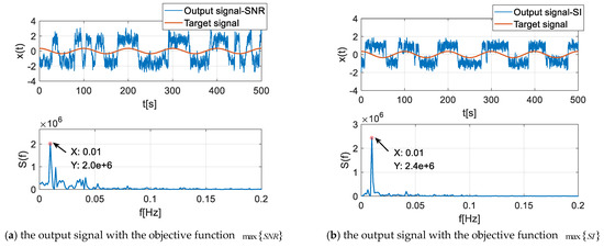 For weak signal under a strong background noise, we adjusted the relevant parameters of SR to promote its occurrence. For this reason, we constructed AUBSR. The noise intensity and the initial group had random values. Figure 9 shows the output signals of AUBSR using and as the objective functions. After several iterations, the optimal system parameter groups of the two algorithms were and . The output SNR of AUBSR increased to −4.7 dB. The SI increased to 0.56. From Figure 9b, we observed that the output signal waveform was more periodic, and the output signal spectrum at the target frequency was clearer. Thus, we calculated that utilizing the SI as a fitness function benefited SR to measure the periodicity of the output signal and the accuracy of the detective frequency at the same time. In future studies, we can also optimize the system performance by setting a suitable threshold of the SI.