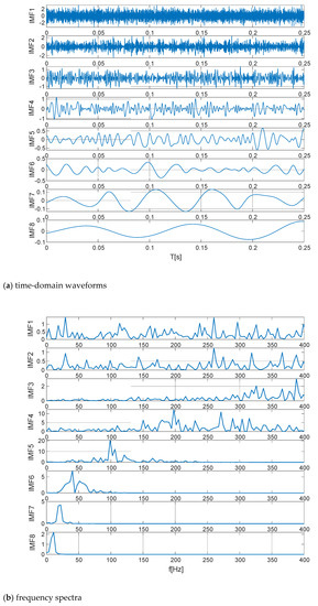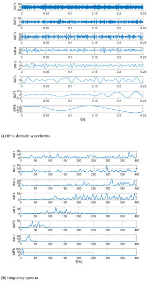 EMD is an adaptive time-frequency decomposition algorithm with no prior knowledge. The complex signal can be decomposed into several IMFs and the residual error through EMD. Each IMF represents a signal with a frequency only at a certain moment, which provides the actual physical meaning of the instantaneous frequency. Each IMF must meet the following two conditions [28]: