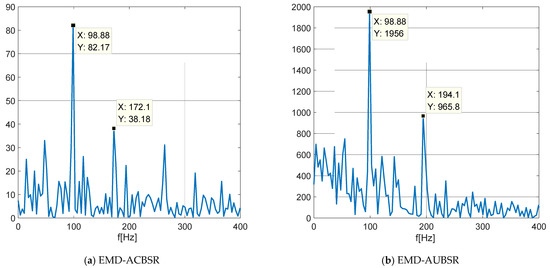 The frequency spectra of output signals of EMD-ACBSR and EMD-AUBSR.