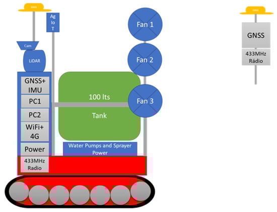To accomplish PRYSM robot features, we had to organise the hardware to avoid interference between sensors and actuators. The planned general organisation for the PRYSM robot is presented in Figure 1. The sensing, communication, and processing units are stored on a tower in front of the robot. For localisation, mapping, perception, and safety, a LiDAR sensor is placed on the top of this tower to ensure that they have an observability of 180° on the robot’s front. The GNSS antenna improves the localisation precision and is placed on the top of the tower. The sprayer is placed in a mast installed in the robot’s back, far away from the sensors to avoid water projection into the sensors. The water pumps and sprayer power are stored below the sprayer tank. The sprayer controller and sensing sensors are placed on the robot front (AgIoT 2.0 module [28], developed by INESC TEC) to avoid exposure to water and increase the vine canopy visibility.